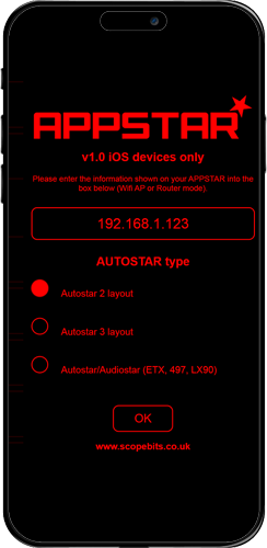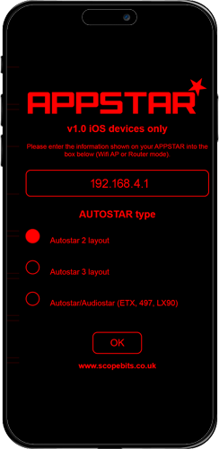 Set APPSTAR to this mode, Enter the information shown on APPSTAR's screen into the box in the app eg 192.168.1.123 Select your handset button layout, and press OK.